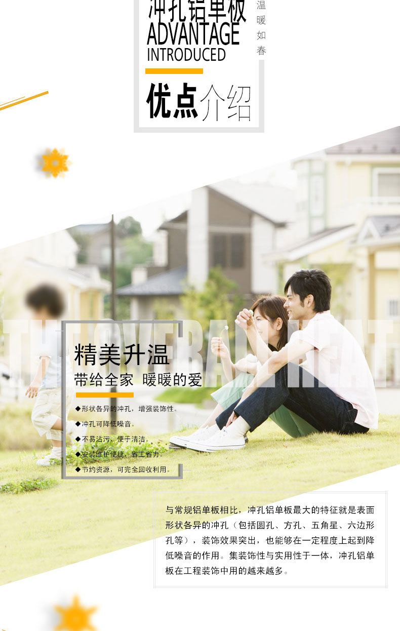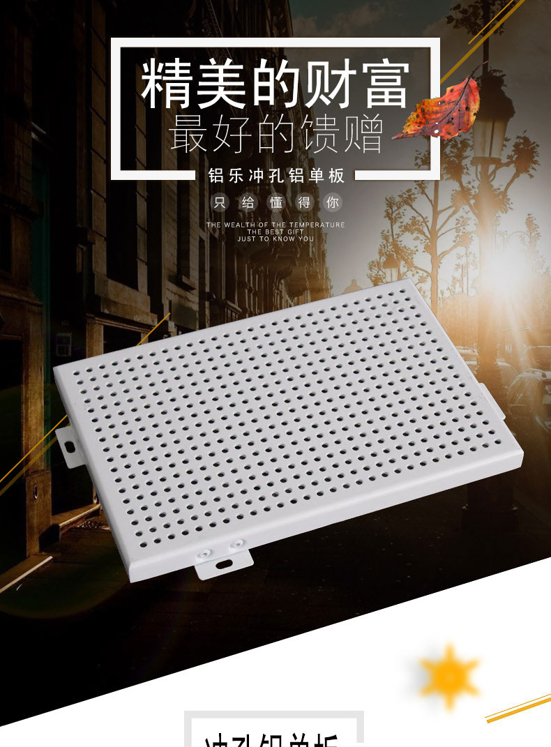 與常規鋁單板相比,沖孔鋁單板的特征就是表面形狀各異的沖孔(包括圓孔、方孔、五角星、六邊形孔等),裝飾效果突出,也能夠在一定程度上起到降低噪音的作用。集裝飾性與實用性于一體,沖孔鋁單板在工程裝飾中使用的越來越多。氟碳沖孔鋁單板特點: