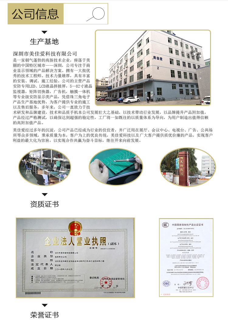 【深圳市美佳愛-液晶廣告機,觸摸一體機生產(chǎn)廠家電話400-997-9971】43寸紅外觸摸一體機(電腦/壁掛)產(chǎn)品通過ISO9001_3C認證,主營多點紅外/電容式觸摸屏一體機,觸控查詢一體機,其他尺寸18.5寸21寸24寸27寸32寸40寸43寸46寸49寸55寸65寸75寸86寸98寸100寸多功能多媒體教學(xué)會議一體機,戶外立式/壁掛雙面廣告機,單機版/安卓網(wǎng)絡(luò)廣告機 豎屏樓宇電梯廣告機,長條型屏,工業(yè)級工控電腦觸摸顯示器,大尺寸觸摸屏查詢系統(tǒng),商顯平板電腦電視,提供報價價格,安裝施工,售后維修等