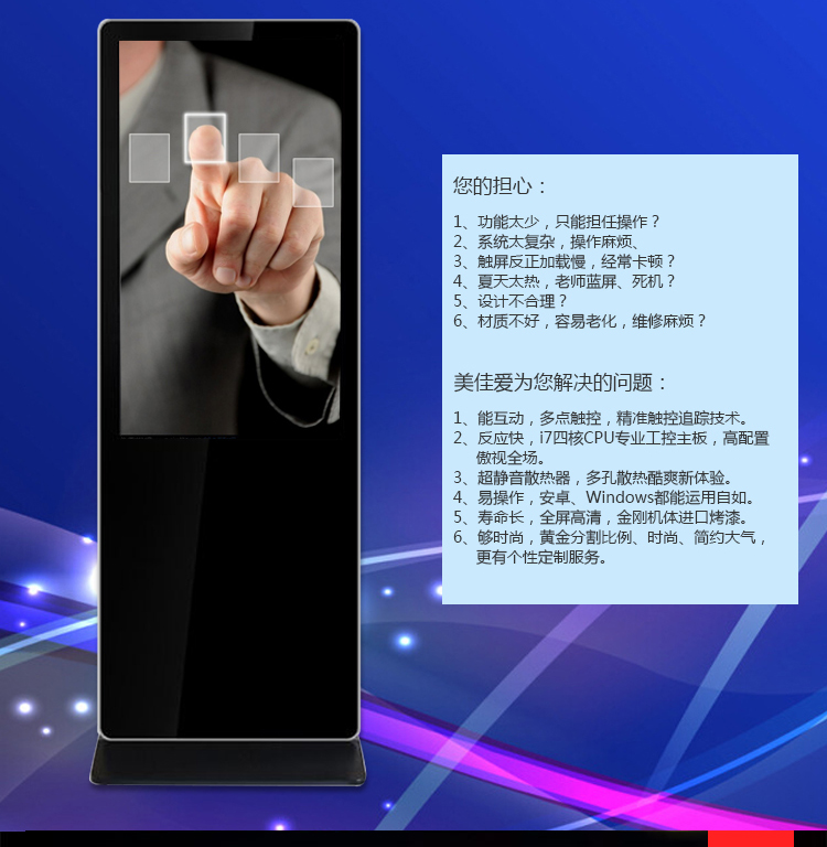 【深圳市美佳愛-液晶廣告機(jī),觸摸一體機(jī)生產(chǎn)廠家電話400-997-9971】49寸紅外觸摸一體機(jī)(安卓/立式)產(chǎn)品通過ISO9001_3C認(rèn)證,主營多點(diǎn)紅外/電容式觸摸屏一體機(jī),觸控查詢一體機(jī),其他尺寸18.5寸21寸24寸27寸32寸40寸43寸46寸49寸55寸65寸75寸86寸98寸100寸多功能多媒體教學(xué)會(huì)議一體機(jī),戶外立式/壁掛雙面廣告機(jī),單機(jī)版/安卓網(wǎng)絡(luò)廣告機(jī) 豎屏樓宇電梯廣告機(jī),長條型屏,工業(yè)級(jí)工控電腦觸摸顯示器,大尺寸觸摸屏查詢系統(tǒng),商顯平板電腦電視,提供報(bào)價(jià)價(jià)格,安裝施工,售后維修等