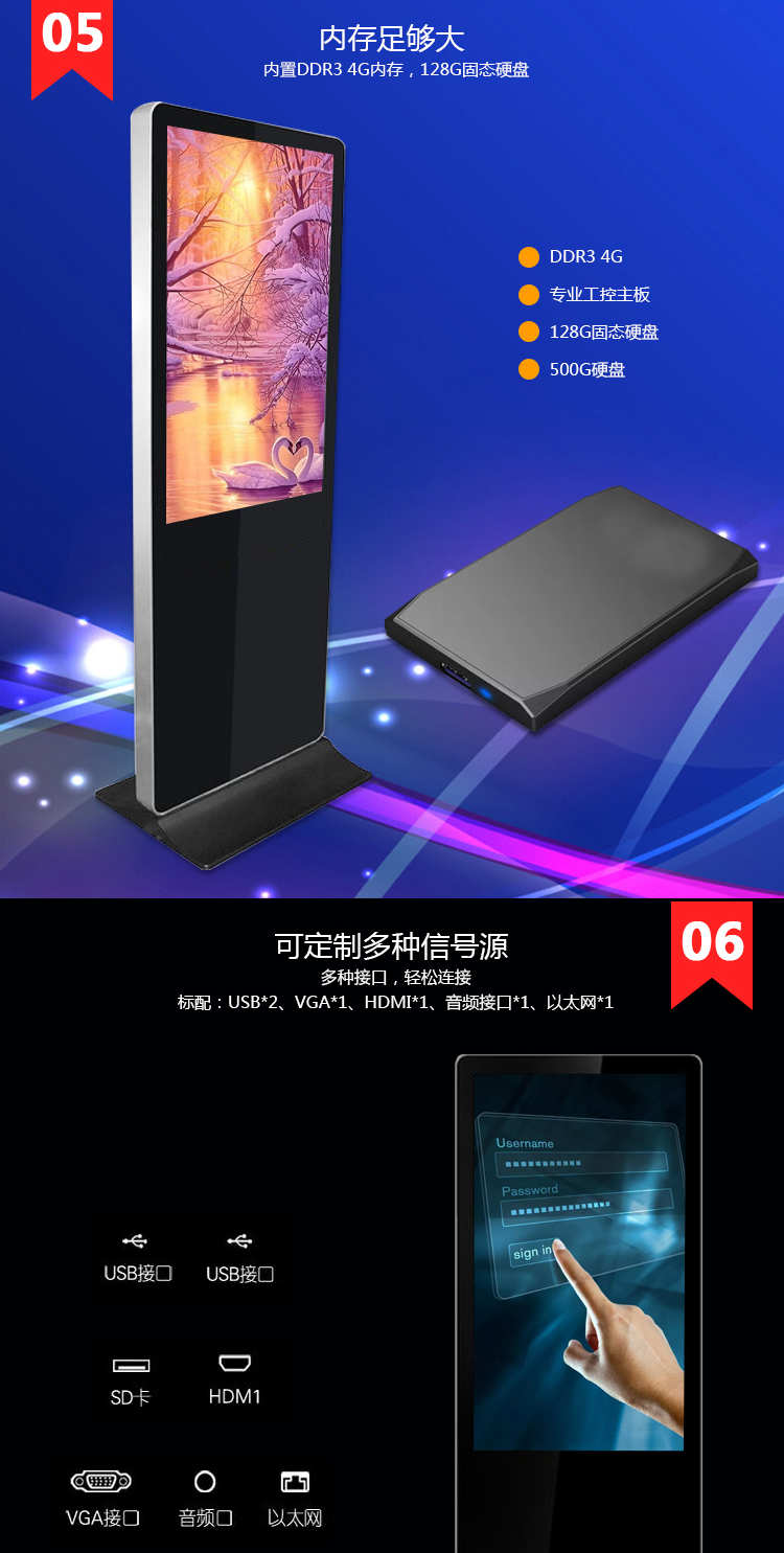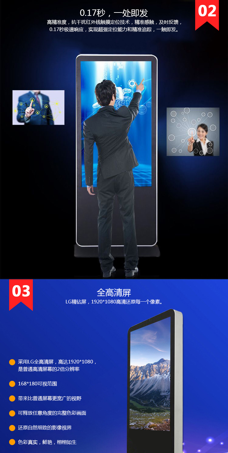 | - 觸摸方式:通過后臺(tái)發(fā)布模板鏈接網(wǎng)頁到終端設(shè)備,當(dāng)沒人觸碰顯示屏?xí)r正常播放廣告,當(dāng)有人觸摸時(shí)自動(dòng)進(jìn)入觸控鏈接模板
