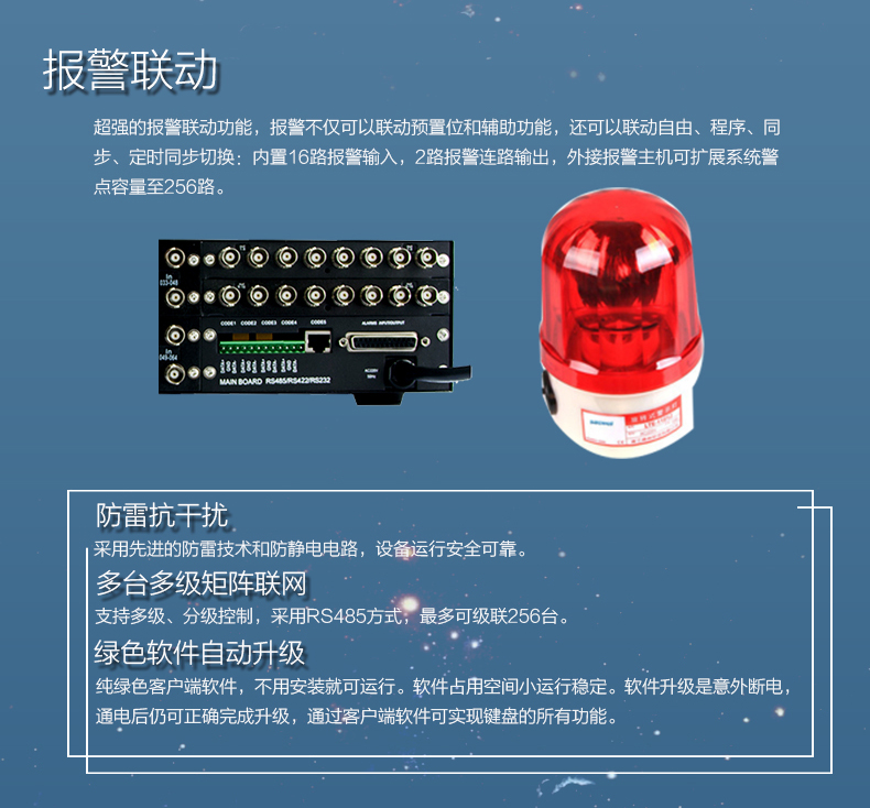 ★ 具有遠(yuǎn)程升級功能,自帶大容量FLASH,存儲數(shù)據(jù)靈活可靠。可以添加新的云臺控制協(xié)議和第三方設(shè)備接口協(xié)議,并實(shí)現(xiàn)系統(tǒng)軟件版本的整體升級;