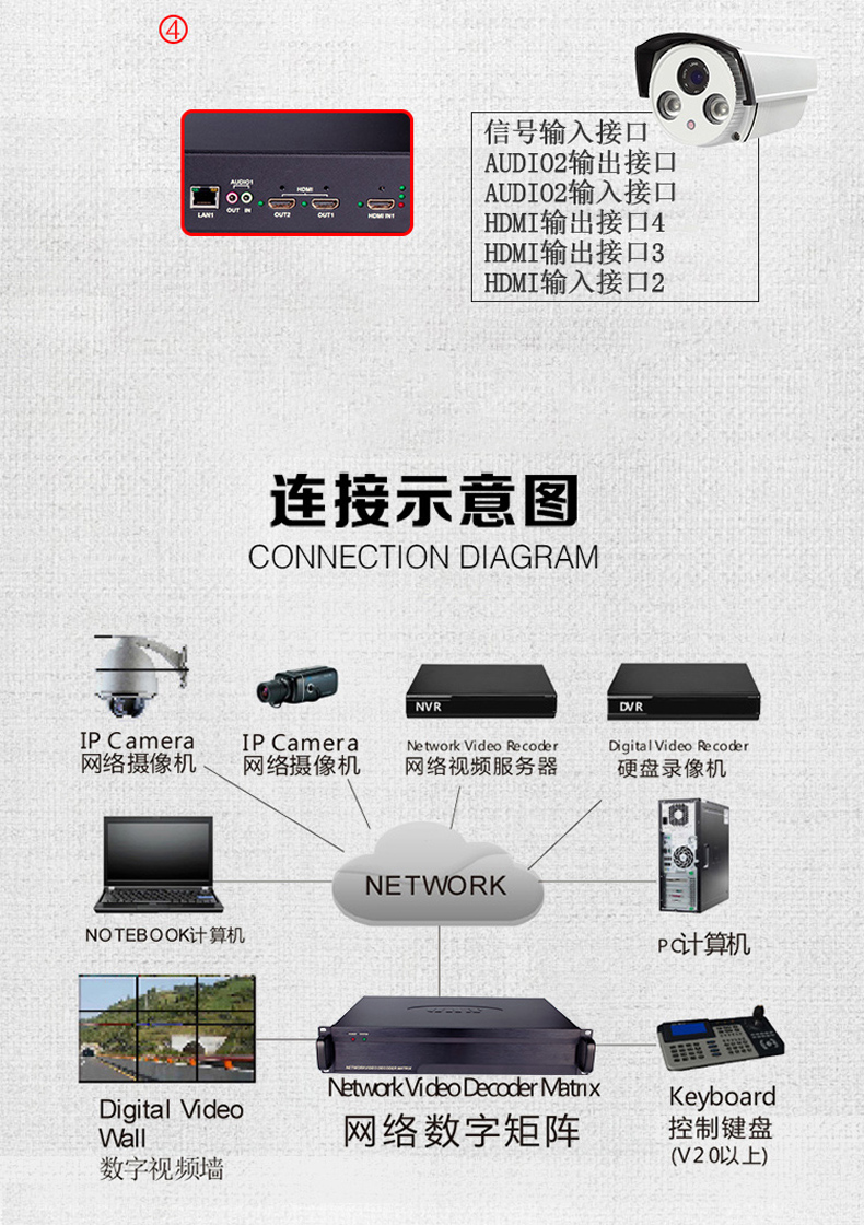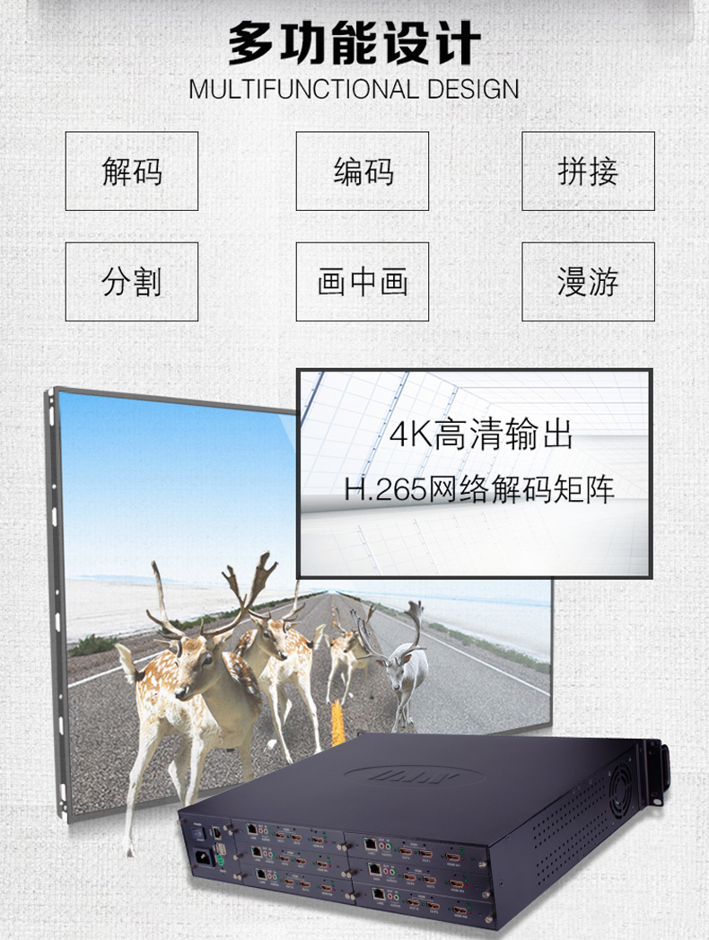 路數:2屏,4屏,6屏,8屏,10屏,12屏,16屏,18屏,20屏,22屏,24屏,26屏,28屏,32屏,36路輸出網絡數字解碼矩陣切換器采用最新的安防專用編解碼芯片,解碼、編碼、拼接、分割、畫中畫、漫游等功能,為工程項目最大程序解決大數據數字化監控系統提供解碼上墻及多信號輸入編碼等提供一站式解決方案;設備采用全鋁標準機箱,結構上大氣美觀可靠,散熱性結構化好