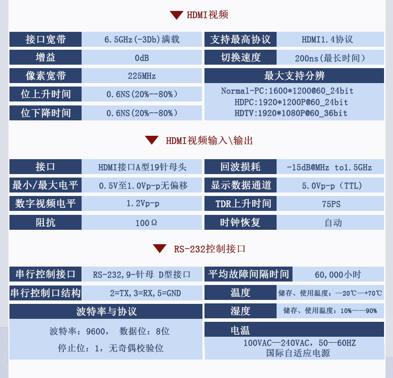 帶長線驅(qū)動功能--- HDMI及DVI輸入端帶數(shù)字均衡調(diào)整電路,輸出帶信號預加重增強電路,使信號能進行更長距離傳輸,輸入輸出都可超過35米距離;