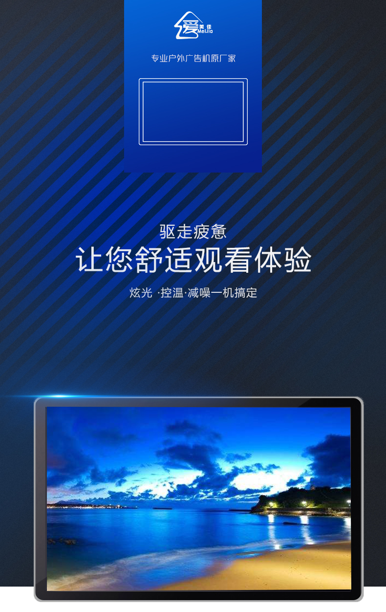 3.2 自主研發智能溫控系統控制盒,可以根據廣告機內部溫度,智能調節整機內部空氣和外部空氣進行時時循環,所有外界風先進入過濾網,把風分成屏前/后兩風道循環。